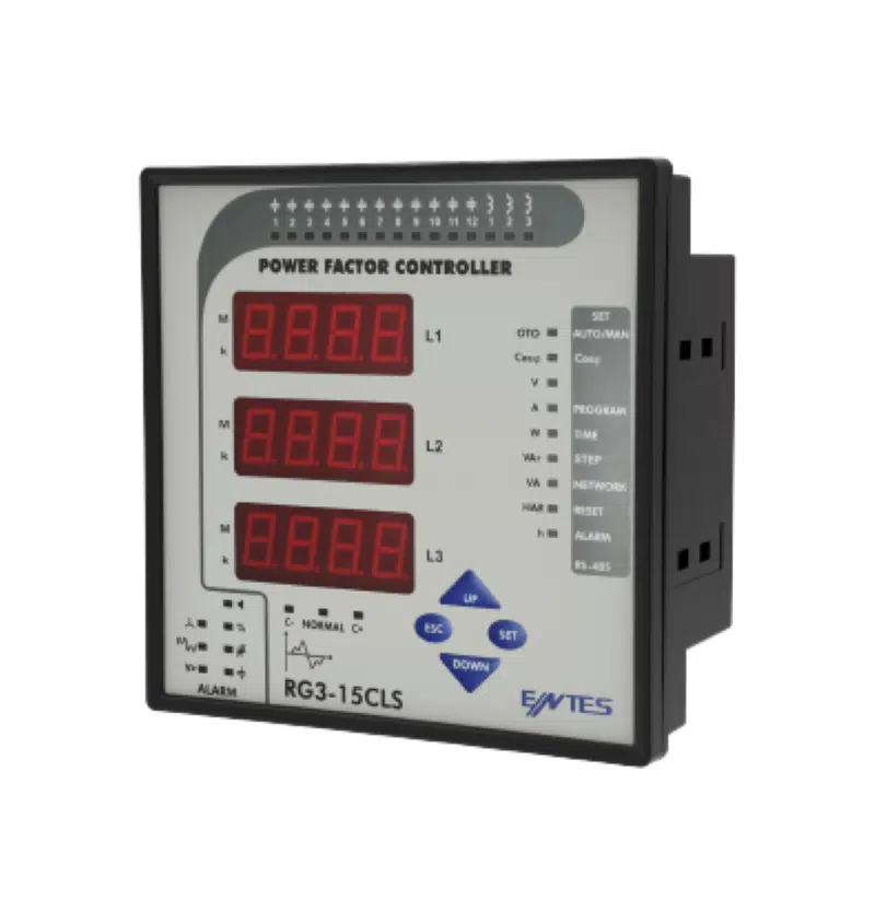 Entes RG3-15CLS, elektrik sistemlerinde reaktif güç kontrolü ve kompanzasyon sağlar. Bu röle, bağlı kondansatör ve şönt reaktörleri kontrol ederek güç faktörünü (Cosφ) istenen seviyeye otomatik olarak getirir. Kompakt panel montajlı tasarımıyla pano içi uygulamalarda kullanılır.