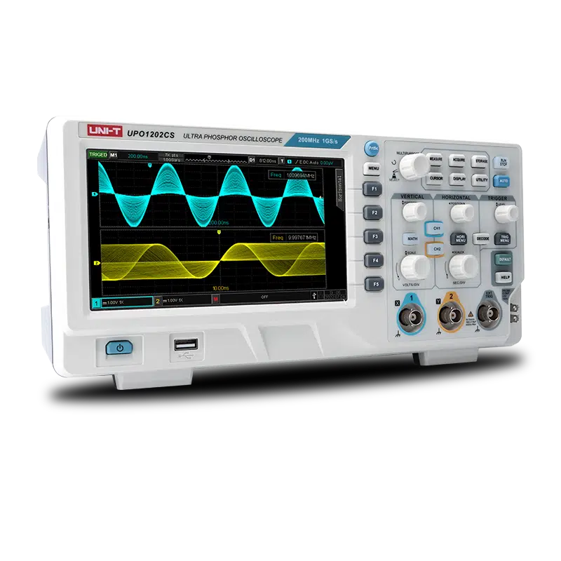 UNI-T UPO1202CS Dijital Fosfor Osiloskop, elektronik mühendisliği, eğitim ve endüstriyel uygulamalar için geliştirilmiş, 200 MHz bant genişliği ve 1 GS/s örnekleme hızına sahip çok fonksiyonlu bir test cihazıdır.