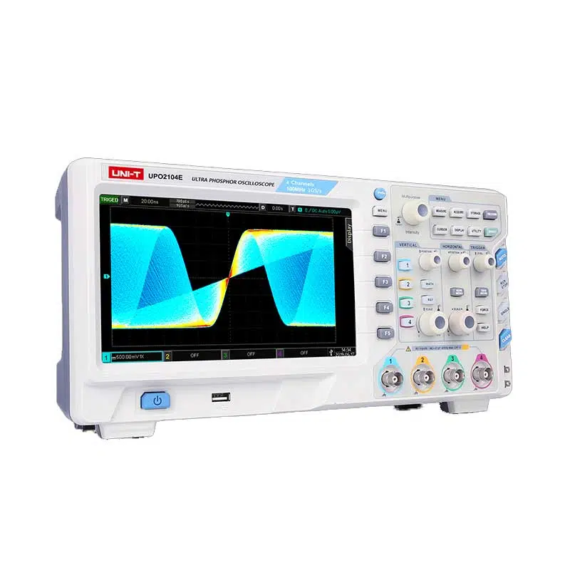UNI-T UPO2104E Ultra Phosphor Dijital Osiloskop, elektronik mühendisliği, eğitim ve endüstriyel uygulamalar için geliştirilmiş, 100 MHz bant genişliği ve 1 GS/s örnekleme hızıyla çok fonksiyonlu bir test cihazıdır.