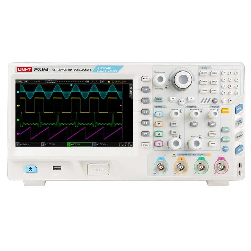 UNI-T UPO3252E Ultra Fosforlu Dijital Osiloskop, elektronik mühendisliği, eğitim ve endüstriyel uygulamalar için geliştirilmiş, 250 MHz bant genişliği ve 2,5 GS/s gerçek zamanlı örnekleme hızına sahip çok fonksiyonlu bir test cihazıdır.