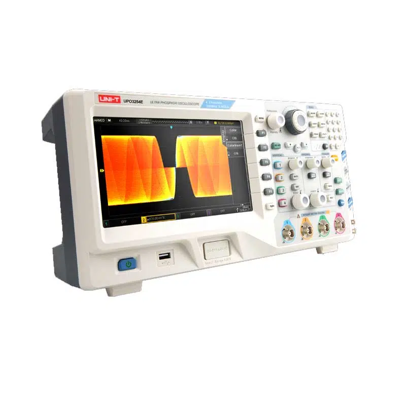 UNI-T UPO3254E Ultra Fosforlu Dijital Osiloskop, 250 MHz bant genişliği ve 2,5 GS/s örnekleme hızıyla, 4 kanallı ölçüm imkânı sunan, gelişmiş analiz ve protokol çözümleme özelliklerine sahip bir test cihazıdır.