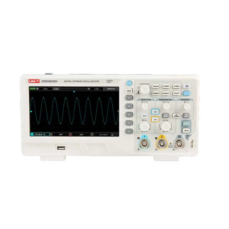 UNI-T UTD2102CEX+ Dijital Hafızalı Osiloskop, 100 MHz bant genişliği ve 1 GS/s örnekleme hızıyla, elektronik devrelerin analizinde güvenilir ve uygun maliyetli bir masaüstü çözüm sunar.